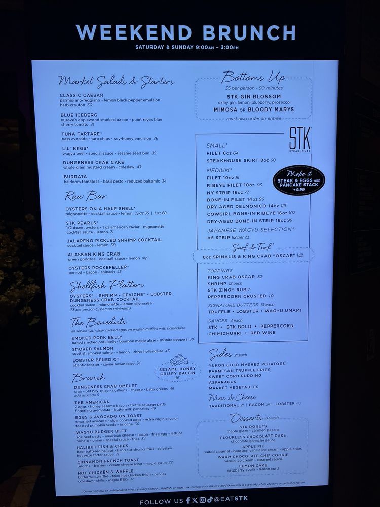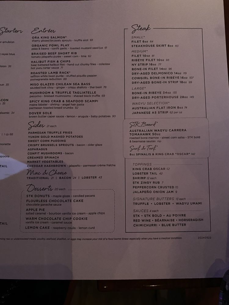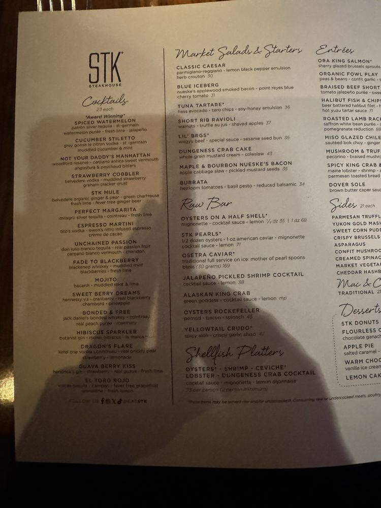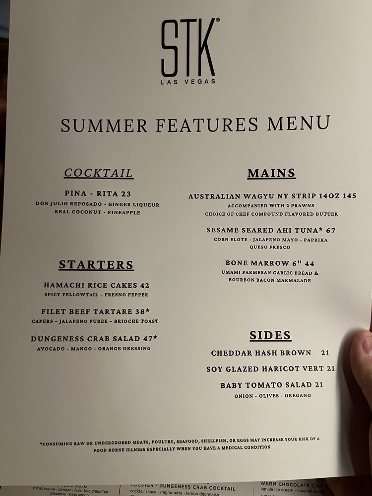 STK Steakhouse, located in Las Vegas, offers a trendy and vibrant dining experience with a focus on New American cuisine. The menu features a variety of market salads, starters, raw bar selections, and shellfish platters. Customer reviews rave about the exceptional service, inviting atmosphere, and top-notch dishes like the short rib ravioli, tuna tartare, and oysters Rockefeller. While some guests find the prices on the higher end, they agree that the quality of food and impeccable service justify the cost. With a DJ playing on weekends, STK Steakhouse sets the perfect ambiance for a night out with friends or a special celebration. Overall, STK Steakhouse is a must-visit destination for steak lovers and food enthusiasts looking for a lively dining experience in Las Vegas.